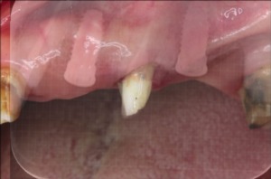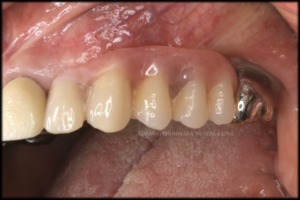 埋入した後は結合するまでに約3〜4ヶ月の期間を有するのですが、期間中に既存の義歯を使用してしまうと、義歯の構造上、インプラント治療中の部位に影響を与えてしまうため、代わりとして左上1から7まで連結した仮歯を作製しました。